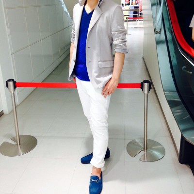 全体的にキレイめのアイテム(ジャケット、白パン)などでまとめ、インナーと靴に青色を使うことで、夏らしい爽やかで涼しいイメージのコーデ。